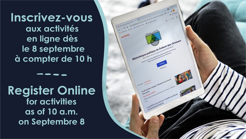 Inscrivez-vous en ligne dès le dimanche 8 septembre à compter de 10 h sur Eventbrite.ca via le site de la bibliothèque.
