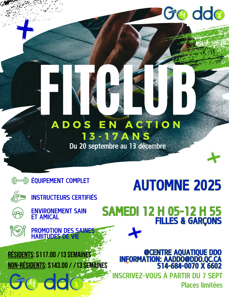 Prépare-toi à bouger, apprendre et progresser avec notre programme FIT CLUB, conçu spécialement pour les ados ! FIT CLUB encourage l’éducation à la santé et au bien-être à travers une approche équilibrée dans un environnement d’entraînement sécuritaire, amusant et motivant. Grâce à une alternance d’ateliers de conditionnement musculaire et de remise en forme, les participants développeront leur confiance, acquerront de nouvelles compétences et profiteront des bienfaits de l’exercice pour la vie.